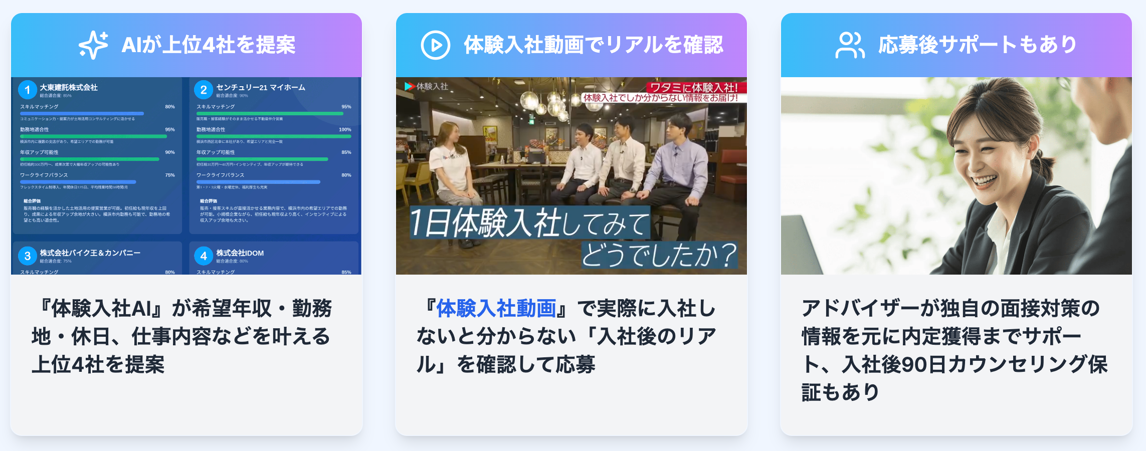 「体験入社動画」などで収集している「実際の仕事内容」「給与」「休日・残業」「社風・人間関係」などの"入社後のリアル"を元にAIが求職者にマッチングする求人企業を徹底的に分析します。