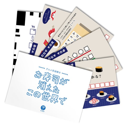 白い封筒の中には謎が散りばめられたポストカードが5枚。お寿司に関する様々な謎が記されています。お寿司が消えてしまった世界でお寿司だらけの謎を解いて、お寿司を復活させることができるでしょうか!?