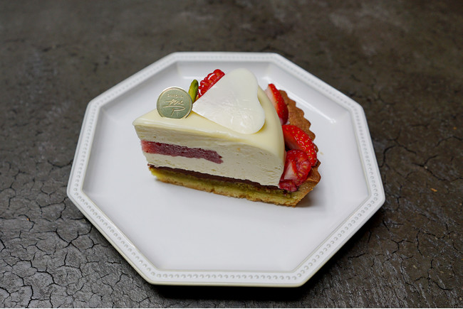 ホワイトチョコレートのムースをベースに、酸味の効いたベリーとコクのあるピスタチオをあわせ、中にはアクセントとしてチョコレートのガナッシュをはさみました。ハート型のチョコレートと苺の飾りがついた可愛らしいタルトで素敵な「ホワイトデー」をお過ごしください。