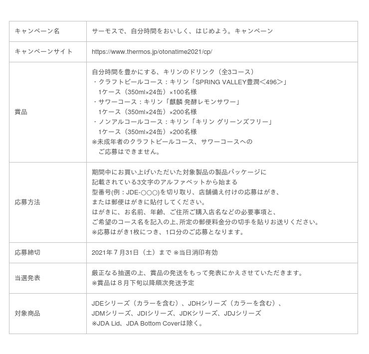 本キャンペーンは、自分時間をおいしくするアイテムの『サーモス 真空断熱タンブラー(JDEシリーズ)』をはじめとする、サーモスのタンブラーやジョッキ、カップなど6シリーズの対象製品をご購入のうえご応募いただくと、自分時間を豊かにするキリンのドリンクが抽選で500名様に当たるキャンペーンです。おうち時間が増えたこの機会に、ぜひサーモスのタンブラーをご購入いただき、ご応募ください。