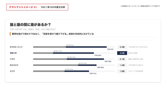 - 他データとの統合分析:会話解析の結果を、顧客属性・購買行動・成果データ(成約・失注・受注額等)と統計的に突合し、行動と成果の因果構造を解明