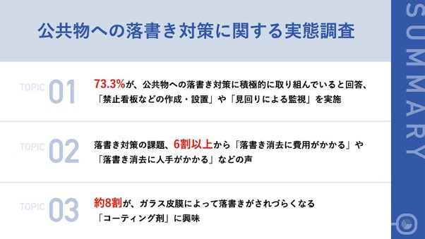本調査では、日頃、落書きを消す作業だけでなく、落書きを防止するための啓発運動にも力を入れている実態が明らかになりました。落書きされる対象物に対し、「ガラス皮膜によって落書きがされづらくなるコーティング剤」を利用することには約8割が興味を示したことから、何度も落書きが繰り返される状況を目の当たりにしている担当者にとっては、コーティングすることによって落書き自体をしづらくさせたり、落としやすくできる対策は、画期的な解決策となるのではないでしょうか。