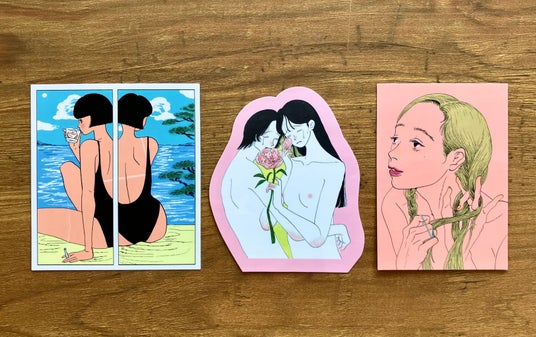 種類:3種類/各・定価550円(税込) 左からステッカー1.「夏」9×10cm、ステッカー2.「シャクヤク」8×10cm、ステッカー3.「三つ編み」7×10cm
