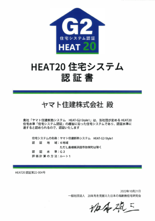 注文住宅を手がけるヤマト住建は、一般社団法人20年先を見据えた日本の高断熱住宅研究会による認証システム「住宅システム認証」でG2認証を取得しました。