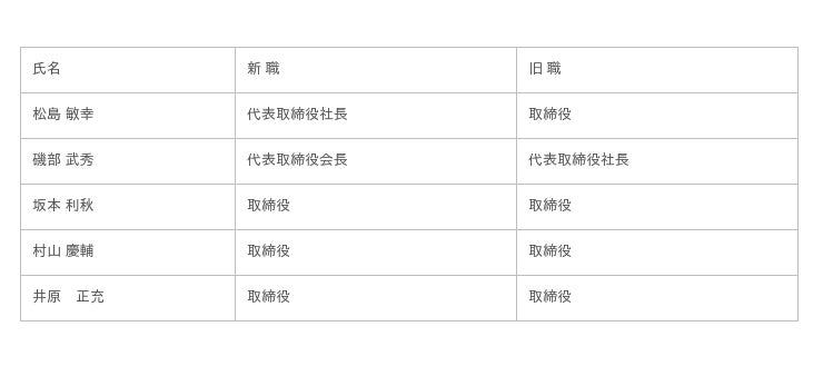 松島敏幸はこれまでも取締役として新規事業開発、新規営業開拓、社内業務オペレーションを統括して参りました。今後はより一層対外的な業務に従事することから、当社の責任者としての立場を明確にするため代表取締役社長に就任いたしました。尚、代表取締役会長となる磯部武秀も各社との業務提携を始めとしてこれまで以上に経営に注力して参ります。
