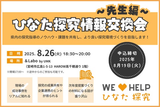株式会社テレビ宮崎と株式会社Study Valleyは、2025年8月26日(火)に宮崎市内にて、高等学校の教員を対象とした情報交換会「ひなた探究情報交換会 ~先生編~」を共同開催いたします。