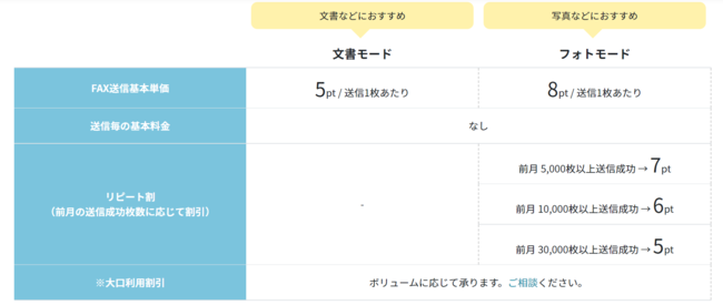 ポイント購入制度を導入しており、事前に購入いただいたポイント(pt)から、送信枚数分を消化することでFAX送信予約ができます。不着分のポイントは返却されます。