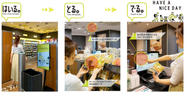 店内に設置されたカメラやセンサーなどの情報から、入店したお客様が手に取った商品をリアルタイムに認識する仕組みです。出口付近の決済端末のディスプレイで表示された購入商品の明細と合計金額を確認し、決済をするだけなので、お客さまにとってストレスなくスマートなお買い物体験が実現できます。