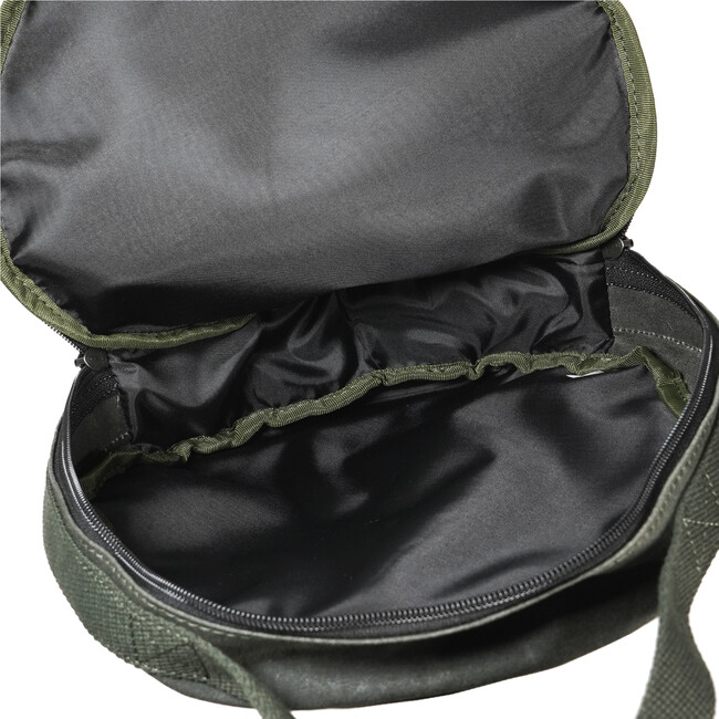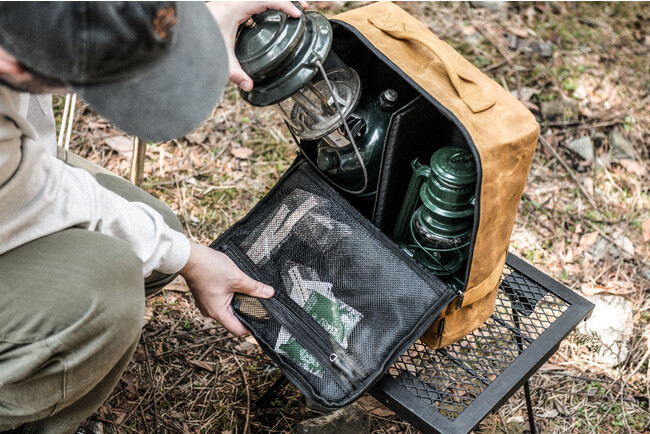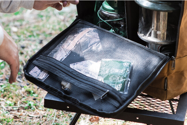 前面フラップのファスナーはあえて途中までしか開かない仕様にすることにより、不安定なフィールドで開けたときでも、ランタンが倒れてくることを防ぎます。