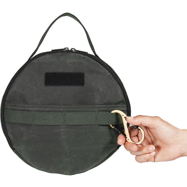 キャンプサイトに置いてもさまになる防水帆布のカバー付き。背面ホックを利用して吊り下げが可能です。