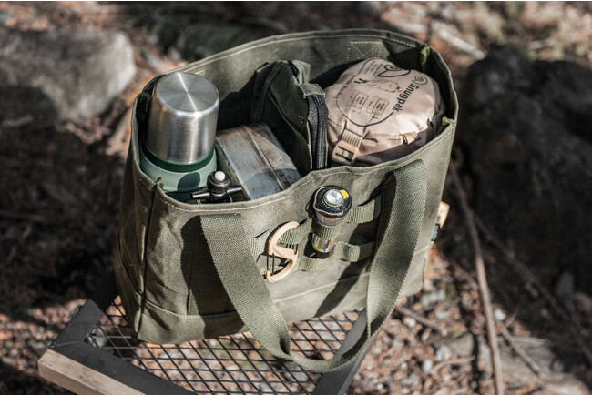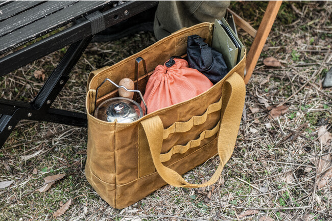 さまざまなキャンプ道具を取り出しやすく収納しやすいトートバッグ。