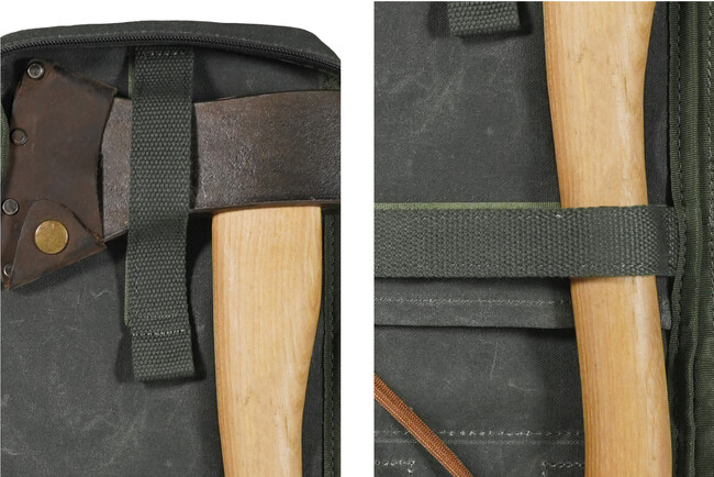 一般的な手斧を面ファスナーでしっかりと固定し、安全に収納・運搬が可能なケース。