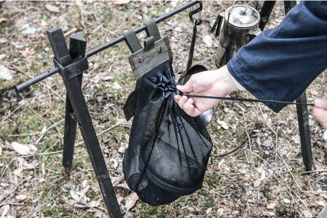 180度に開き、左右についた持ち手をフックやカラビナで吊るせば、焚き火オーガナイザーとしていつでも近くに吊るしておくことが可能です。