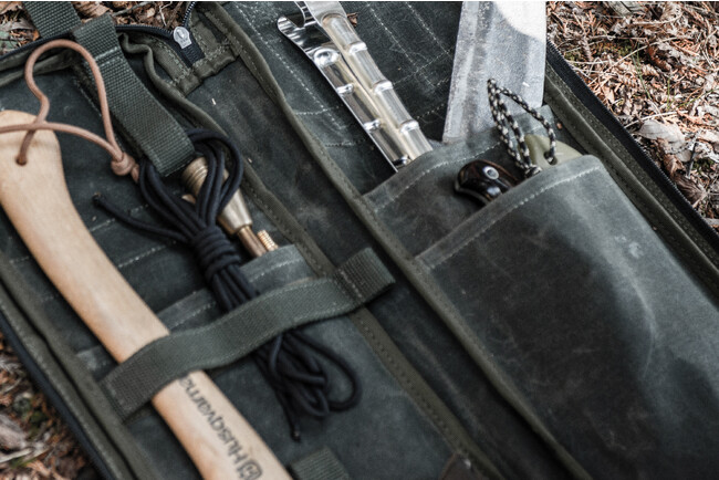 火ばさみ・鉈・火吹き棒のように焚き火道具に多い細長い形状のアイテムを取り出しやすい作りとなっています。