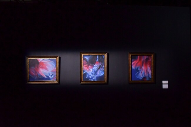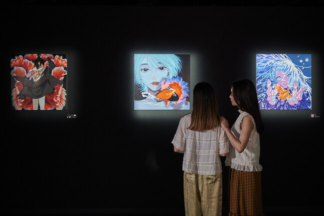 『女性と金魚/鯉』をテーマにしたデジタルアートが並びます。フォロワー40万人を誇り数々の業界とコラボレーションし活躍する「tamimoon」、音楽サービスで大ヒットしたくじら「金木犀 feat. Ado」のMVデザインした「世津田スン」、数々の書籍や音楽コンテンツのイラストを手掛ける「LOWRISE」、MVデザインを手掛けたMAISONdes『ヨワネハキfeat. 和ぬか, asmi』は3600万再生を突破した「NAKAKI PANTZ」、人気ボカロP「wotaku」 の「シャンティ」のMVイラストを手掛ける「亞門弐形」、「高校生イラストコンテスト2019 by pixiv」最優秀賞を受賞作家「ろ樹」など豪華メンバーが勢揃いします。