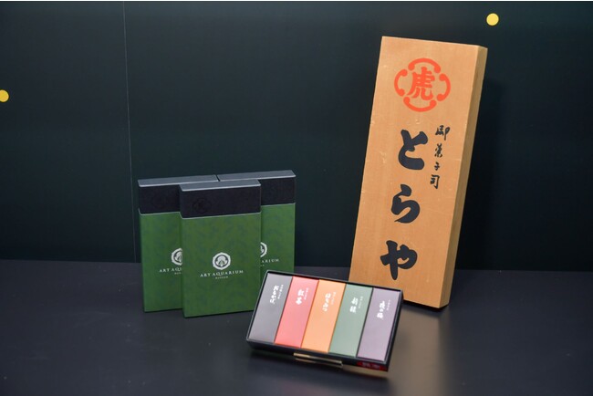 「とらや」を代表する小倉羊羹『夜の梅』を含む5種類の羊羹を、アートアクアリウムオリジナルの掛け紙でご用意しました。