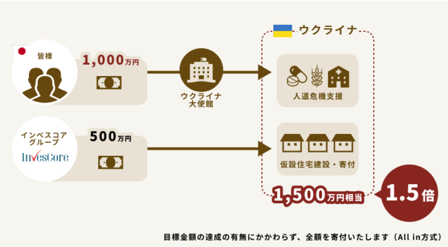また、みなさまからいただいた寄付金額の50%相当の金額を当社グループより拠出し、ウクライナ現地にて、仮設住宅を建築のうえ、寄付をさせていただきます。お客様に寄付いただいた金額の1.5倍相当がウクライナへ贈られることとなります。