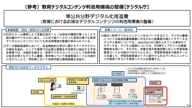 7月にはデジタル庁より、システム開発や教育、AI等様々な知見が必要となる「教育における広域なデジタルコンテンツの利活用環境の整備に向けた調査研究」が公告されました。