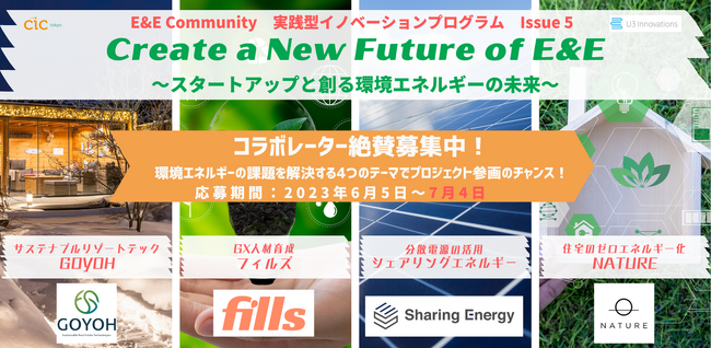CIC Tokyo(本社:東京都港区虎ノ門、職務執行者: Timothy Rowe)及びU3イノベーションズ合同会社(本社:東京都港区虎ノ門、共同代表:竹内 純子、伊藤 剛)が立ち上げた環境エネルギーイノベーションコミュニティ(以下「E&Eコミュニティ」という。)は、実践型イノベーションプログラムの第5弾として、先進的な技術とアイディアをもつスタートアップ4社による、環境エネルギー関連の課題をテーマとしたプログラムの参加者(大企業や中小企業、スタートアップ、研究者、自治体等)を募集します。