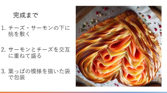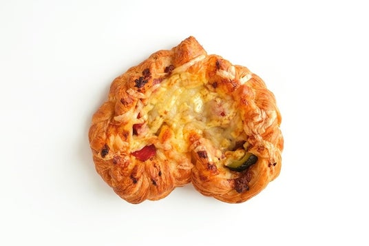 クロワッサン生地に、ベーコン、グリル野菜、味噌の肉そぼろ、クリームチーズをトッピング。隠し味に桃ジャムを使用しています。かわいい桃型に仕上げました。