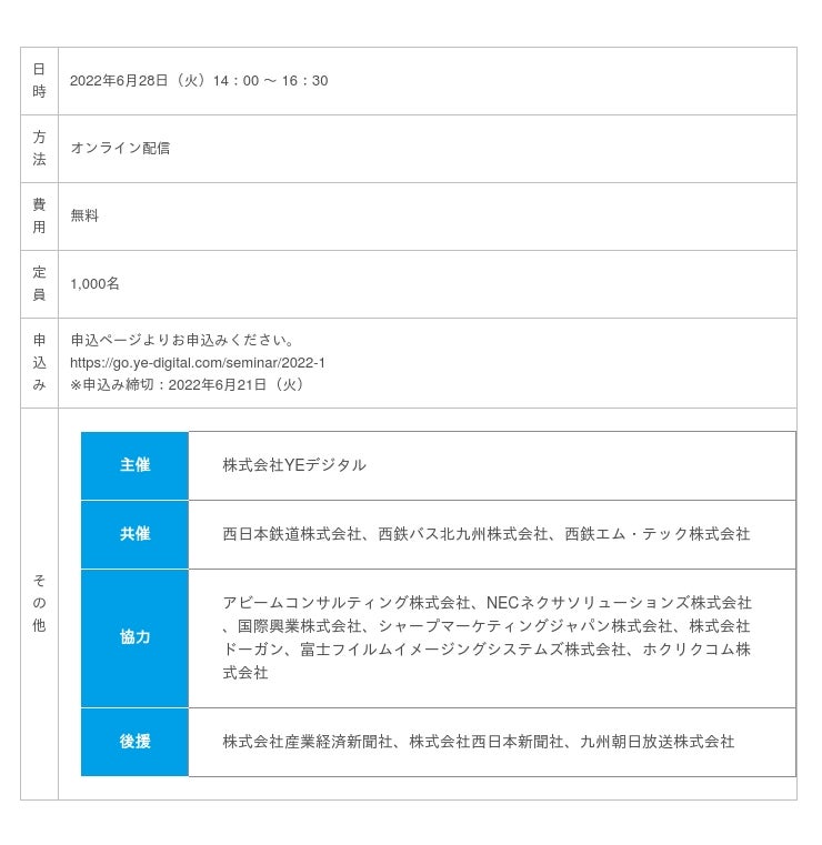 デジタルを活用したまちづくりを促進する株式会社YE DIGITAL(本社:北九州市小倉北区 代表取締役社長:遠藤直人、以下、YEデジタル)は、この度、当社が提供するスマートバス停の100基突破を記念して、持続可能なまちづくりのさらなる発展に向けた最新の事例や今後の展望を紹介するシンポジウムを2022年6月28日にオンラインで開催いたします。