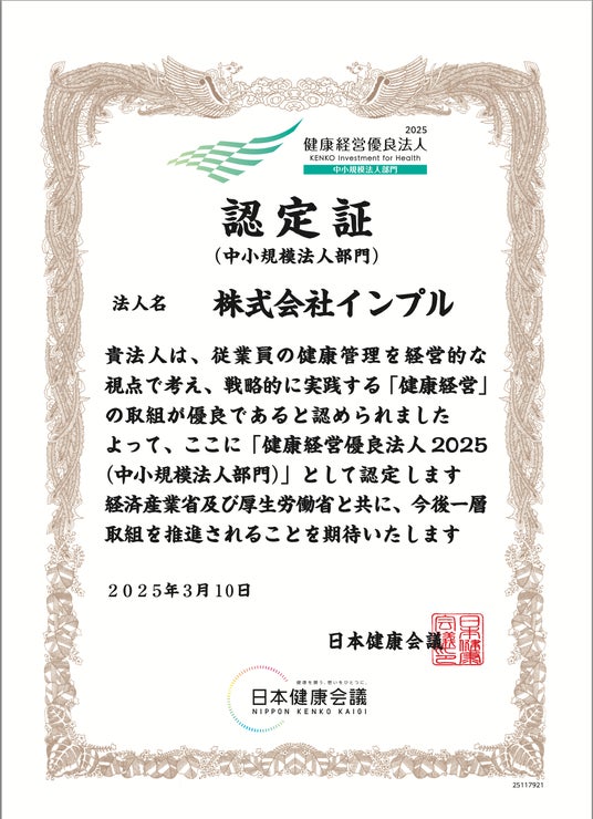 株式会社インプル(以下、弊社)は、経済産業省と日本健康会議が共同で実施する「健康経営優良法人2025(中小規模法人部門)」に認定されました。