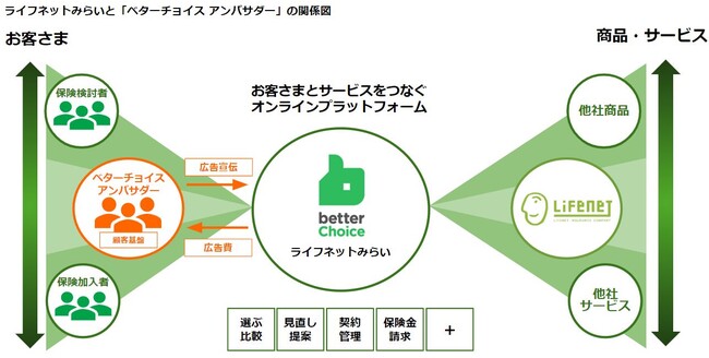 「ベターチョイス アンバサダー」制度は、「ベターチョイス アンバサダー」に参画いただいた事業会社さま・金融機関さまが、自社のウェブサイト内に、ネット保険を一括で比較できる「ベターチョイス」のサービスサイトへの導線(バナー、テキストリンク)を設置することで、家計の節約などをきっかけに生命保険を手軽にネットで比較して検討したい自社のお客さまにオンライン上での保険選びの機会を提供するものです。この取り組みによって、お客さまは、オンライン上で保険の比較検討をスムーズに行うことができます。(保険募集を行うのはライフネットみらいであり、「ベターチョイス アンバサダー」は保険募集を行いません。)