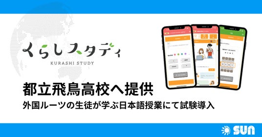 SUN株式会社(本社:東京都港区、代表取締役社長兼CEO:仲宗根俊平、以下 SUN)は、日本語学習アプリ『くらしスタディ』を東京都立飛鳥高等学校に提供。外国にルーツを持つ日本語の支援が必要な生徒が学ぶ日本語指導にて、試験導入を2023年12月より開始いたしました。