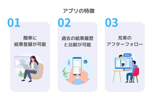 本アプリは、検査結果をアプリへ登録することで、受検者の利便性と健康管理への意識をより向上させ、「せっかくの結果確認が一度きり」ではなく、ユーザーの継続的な健康管理に役立てていただきたいと考えています。検査結果をいつでもどこでも簡単に確認できるだけでなく、過去の履歴も一元管理が可能です。単なる記録ではなく、「過去から未来へ、自身の健康の見える化」をすることで、受検者が自らの健康と継続的に向き合うだけでなく、アフターフォローを活用しやすくすることで、健康改善をサポートしたいと考えています。