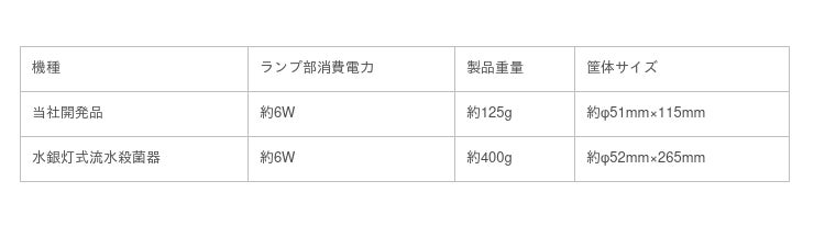 これまでのUVC LED(発光効率1~5%)は水銀灯(発光効率20~40%)と比較して発光効率が低いため、同じ消費電力では流水殺菌能力が低くなるのが一般的でした。しかし、当社のもつ光学設計と流体設計の技術による流水殺菌器の性能向上と、発光効率が向上した当社のKlaran LAを使用することにより、消費電力が同等の水銀灯を用いた流水殺菌器の性能を上回るUVC LED流水殺菌器の実現に成功しました。当社は、本検証結果について殺菌用光源のLED化が加速する大きな技術的前進であると考えています。
