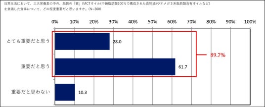 日常生活において、三大栄養素の中の、脂質の「質」(MCTオイル(中鎖脂肪酸100%で構成された食用油)やオメガ3系脂肪酸含有オイルなど)を意識した食事について、どの程度重要だと思うか質問したところ、89.7%の医師が重要だと思うと回答した。