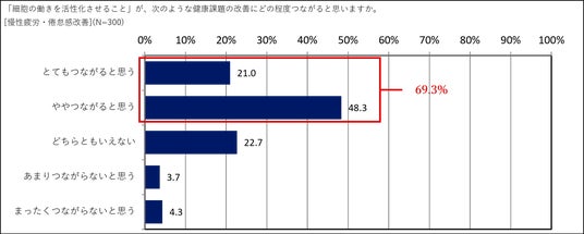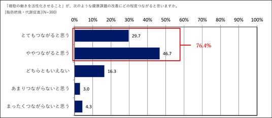 「細胞の働きを活性化させること」が、健康課題の改善にどの程度繋がると思うか医師に質問したところ、「脂肪燃焼・代謝促進」については76.4%、「慢性疲労・倦怠感」については69.3%の医師が改善に繋がると思うと回答。「細胞の働きを活性化させること」が健康課題の改善において深く関与していることがうかがえる。