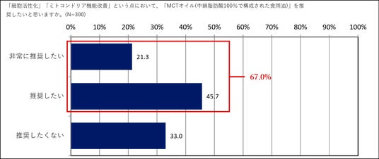 「細胞活性化」「ミトコンドリア機能改善」という点において、「MCTオイル(中鎖脂肪酸100%で構成された食用油)」を推奨したいと思うか質問したところ、67.0%の医師が「MCTオイル」を推奨したいと回答した。