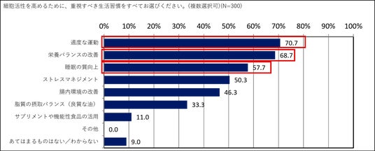 細胞活性を高めるために、重視すべき生活習慣について医師に質問したところ、1位「適度な運動」で70.7%、2位「栄養バランスの改善」で68.7%、3位は「睡眠の質向上」で57.7%という結果となった。
