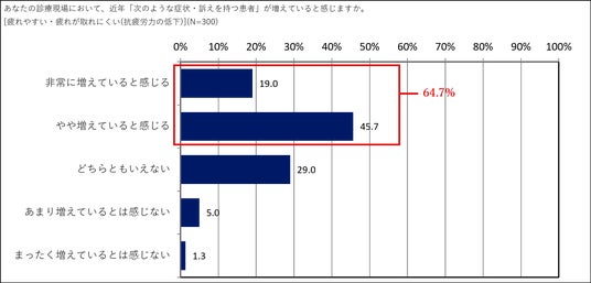 診療現場において、近年「太りやすい・痩せにくい(脂肪燃焼力の低下)」「疲れやすい・疲れが取れにくい(抗疲労力の低下)」といった症状・訴えを持つ患者が増えているかどうか質問した。すると「太りやすい・痩せにくい(脂肪燃焼力の低下)」については、62.4%、「疲れやすい・疲れが取れにくい(抗疲労力の低下)」についても64.7%が増えていると感じると回答。診療現場においても上記のような症状・訴えを持つ患者が増えていることが分かった。