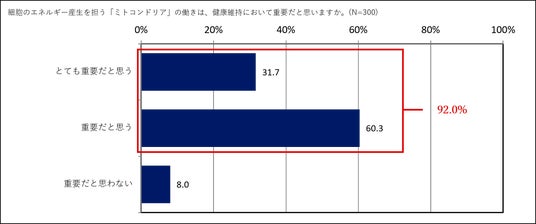 細胞のエネルギー産生を担う「ミトコンドリア」の働きは、健康維持において重要だと思うか医師に質問したところ、92.0%が重要だと思うと回答。「ミトコンドリア」の働きが健康維持において重要な役割を果たすことが分かった。