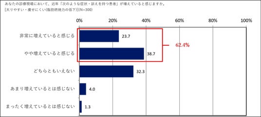 - 診療現場において、「太りやすい・痩せにくい(脂肪燃焼力の低下)」患者の増加を感じる医師が62.4%、「疲れやすい・疲れが取れにくい(抗疲労力の低下)」患者の増加を感じる医師が64.7%
