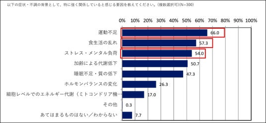 - 「脂肪燃焼力の低下」「抗疲労力の低下」に強く関係している要因の1位は「運動不足」が66.0%、2位「食生活の乱れ」が57.3%