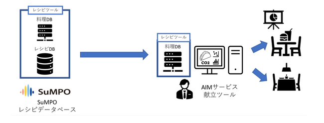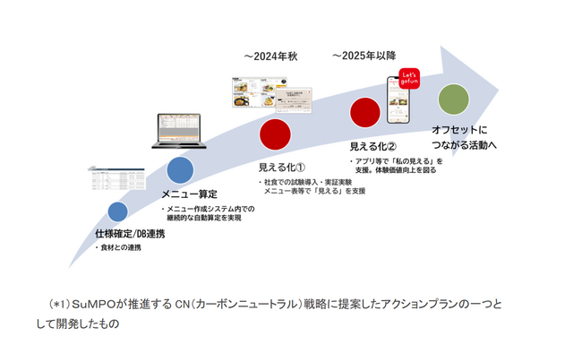 本プロジェクトでは、グループ合計全国約3,900カ所で1日約130万食の食を支えるエームサービスのシステムなどと、SuMPOが構築した「レシピdeカーボンフットプリント(炭素版カロリー)」(*1)を連携し、食事メニューへの継続的なGHG排出量表示のためのインフラ開発を推進。2024年秋ごろより三井物産株式会社の社員食堂において実証実験を予定しています。これにより、食事や栄養摂取を管理するための指標となるカロリー表示と同様、消費者が地球の健康バロメーターとして日常生活の中で「カーボン(CO2)」に触れ、実感し、意識できる社会を目指します。