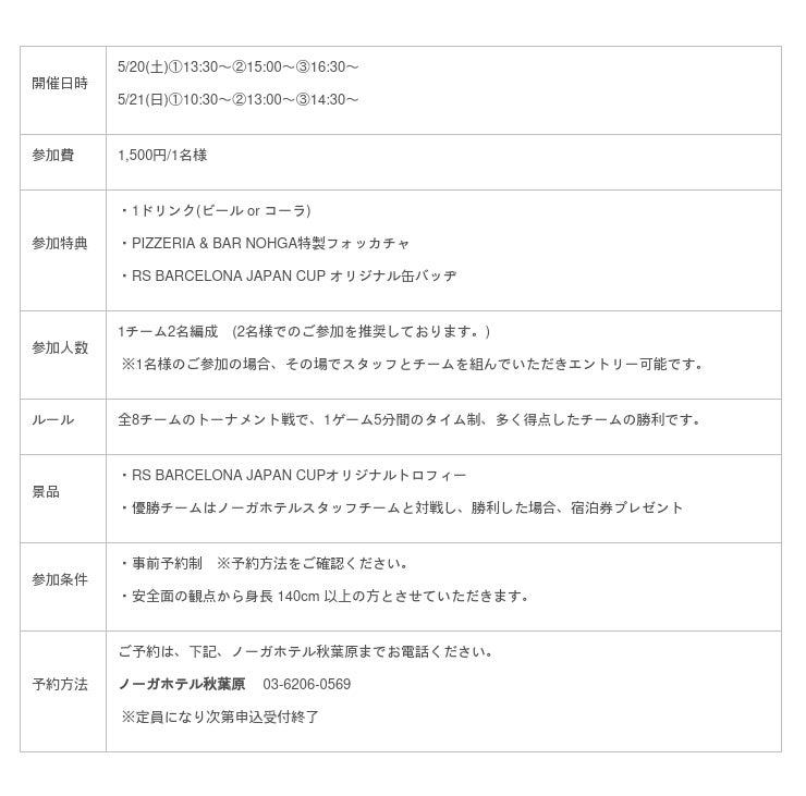 野村不動産ホテルズ株式会社(東京都新宿区/代表取締役社長:石井 康裕)が運営するNOHGA HOTEL AKIHABARA TOKYO(以下、「ノーガホテル秋葉原」)は、ヨーロッパを中心とした世界のインテリアデザインブランドインポーターであり、台東区蔵前でショールームを運営するTISTOU株式会社(以下「TISTOU」)が扱うフットボールテーブル(別名「サッカーテーブル」)を使用した「RS BARCELONA JAPAN CUP」を2023年5月20日(土)、21日(日)に開催いたします。