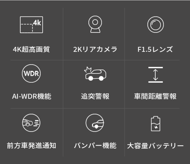 「MINIEYE-4KPro」はコロナ禍で車での移動が増えてきている現状を基づいて開発された、あなたの運転をサポートするAI技術搭載衝突予防車載ガジェットです。4種の警報モードが搭載され、自動車であればコンパクトカー、SUV、ミニバン、トラックなど、ほとんどの車種を認識できます。さらに4K解像度レンズとナイトビジョン機能が搭載され、ドライブレコーダーとしても優れています。