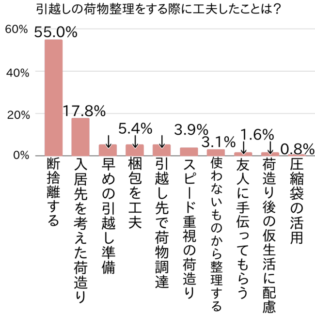 ただ、やはり十分な整理が必要でなかなか時間が取れず、要不要を考えずにとにかく梱包する「スピード重視の荷造り(3.9%)」が現実的だったという意見もありました。