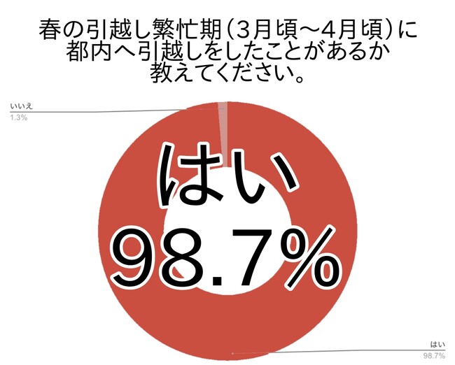 アンケートでは、春の引越し繁忙期に都内へ引越しをしたことがあるという方は98.7%でした。今回の回答者に関しては、春の引越しを経験したことがある方がほとんどだという結果になりました。