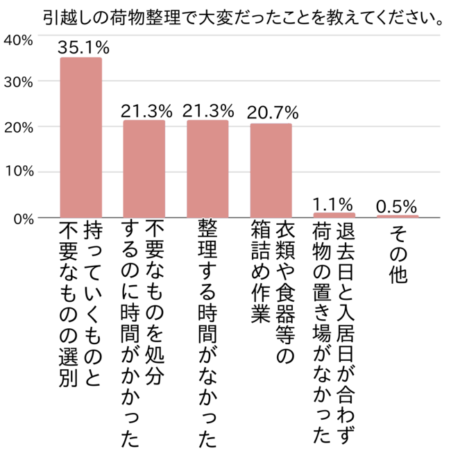 「整理する時間がなかった(21.3%)」という声が特に多く、忙しいスケジュールの中で手間取る作業として「衣類や食器等の箱詰め作業(20.7%)」がきつかったという意見が多くあがりました。