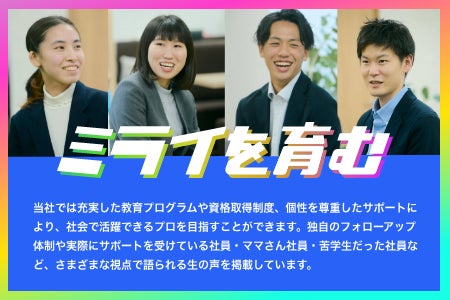 当社では充実した教育プログラムや資格取得制度、個性を尊重したサポートにより、社会で活躍できるプロを目指すことができます。独自のフォローアップ体制や実際にサポートを受けている社員のみなさんの生の声を掲載しています。