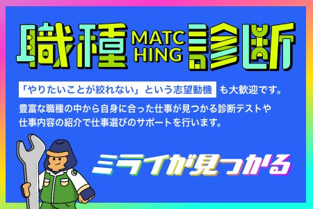 「やりたいことが絞れない」という志望動機も大歓迎です。豊富な職種の中から自身に合った仕事が見つかる診断テストや仕事内容の紹介で仕事選びのサポートを行います。
