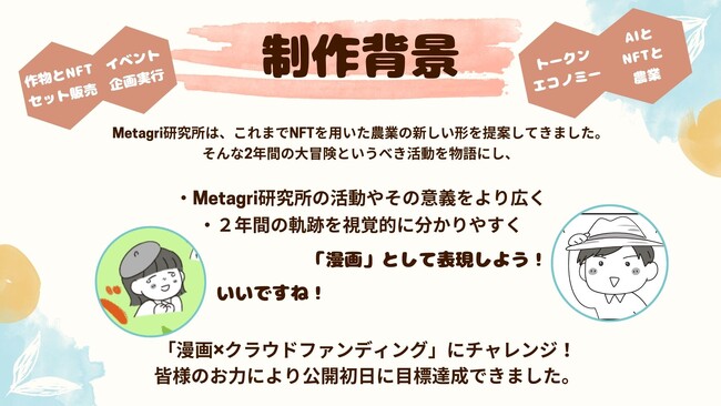 「Metagri物語プロジェクト」は、クラウドファンディング公開初日の2023年9月22日に目標金額を達成しました。