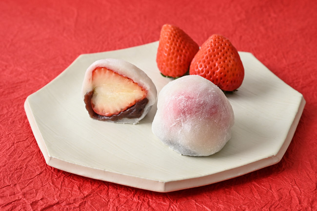 北海道産の半小豆餡と、歯切れの良い糯米“マンゲツモチ”で大粒のいちごを丸ごと包みました。