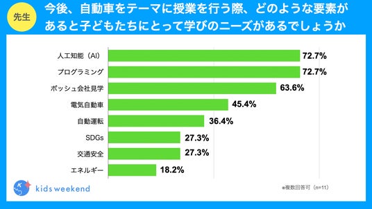 また、先生たちを対象に行ったアンケートでは、「自動車をテーマにした授業で、どのような要素があれば子どもたちの学びのニーズに応えられるか」という質問に対し、「人工知能(AI)」「プログラミング」といった回答が寄せられました。また、「実際にボッシュの会社を見学したい」という意見もあり、オンライン授業をきっかけに企業への関心が高まっている様子が伺えました。