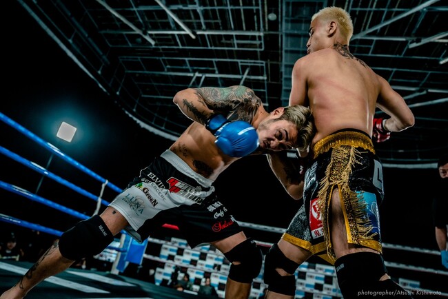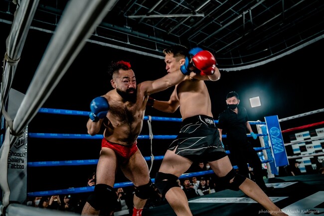 試合中も「こいよ!」「逃げんじゃねーぞ!」という雄叫びが飛び交いながらの激しい攻防。元K-1選手の圧力を武器に、とめどない攻撃で攻め続ける冨澤選手と、力のあるパンチで負けじと向かい受けるとしぞう選手。前に出ようとするとしぞう選手を、蹴りを交えながらノンストップで打ち続ける冨澤選手の勢いが上回り、終始主導権を握り、判定勝利しました。